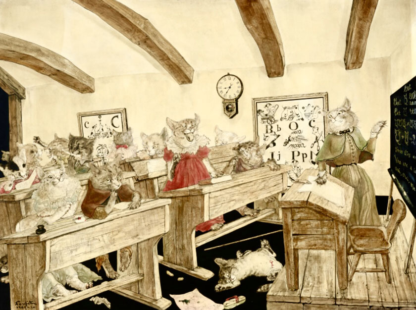 『猫の教室』これは楽しい!騒々しい猫たちの騒ぎが聞こえてくるようです。床に寝転んでいる子(ネコだけにw)、よく見れば机の下に隠れる子、窓の外にいる子、飽きませんねーw