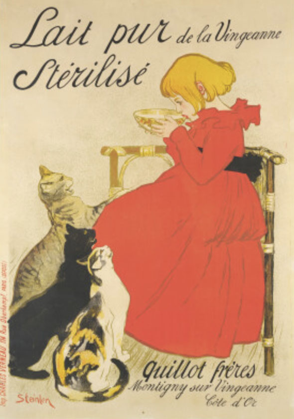 テオフィル=アレクサンドル・スランタン『ヴァンジャンヌの殺菌牛乳』。スランタンも猫好きだったようで猫が登場する作品多いです。あちこちで観た気が。あまり版画のポスター作品は好みではないのですが猫登場となれば別w 猫たちの顔があまり可愛くないのもツボですww