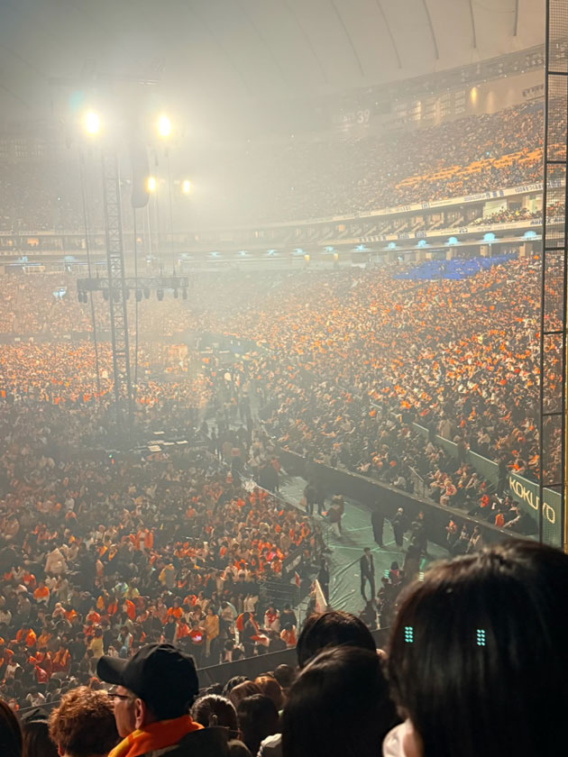日曜日は1階スタンドでした。アリーナでない段階で大勝利w それにしても…これはアリーナ後方の様子ですが、物凄い椅子の並べ方じゃないですか?ドームのアリーナでこれほど隙間が無いのは初めて見た気がします。凄いなー。この週末で1日公称55,000人。2日間で11万人とのことでしたが、んーもっと入っていないかな。消防法的に55,000人以上とは言えないですよね…(^^; ともあれ東京ドームがオレンジ一色!野球の時でさえ一塁側だけだというのにww