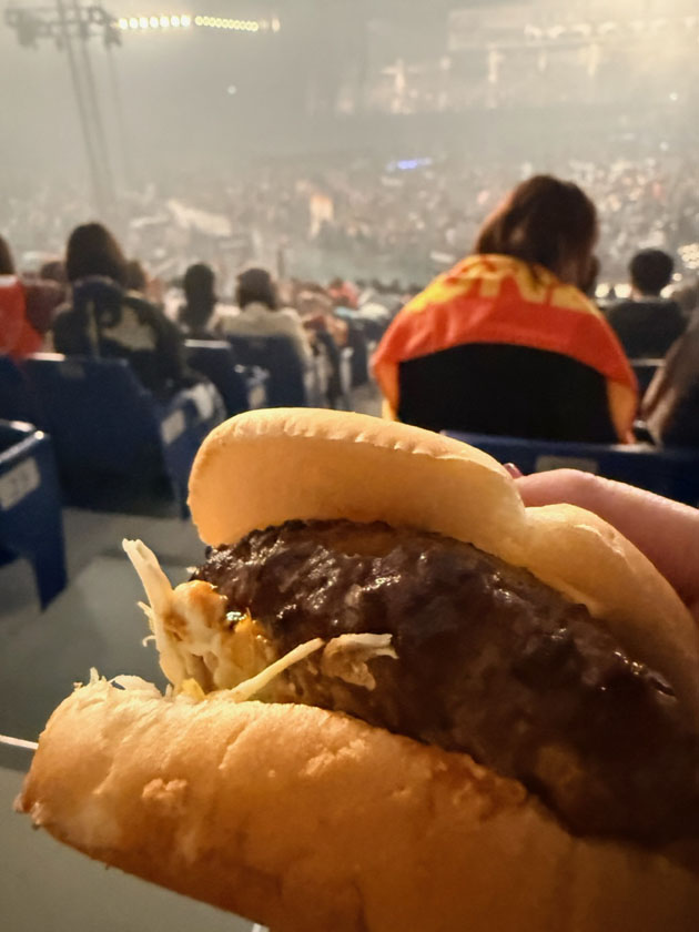 ありがたい通路席。この日は遅めのランチでドーム・メンチカツ・バーガーです。美味しかった!