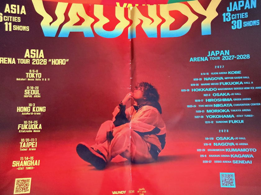 再びVaunyです。東京ドーム2デイズのラストで、今後のツアー2種が発表されました。アジアツアーと国内アリーナツアー。アジアツアーにある東京と福岡はスタンディングなのでパスとして、アリーナツアーは楽しみとはいえ2027-2028ですよ!早くて来年後半!!今まだ2026の初頭なんですけどw もちろん申し込んだけど…先過ぎるww というわけで、Vaundyはチケ販売がやたら早いので、これを読んで興味持った方はお早めに!!